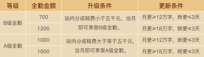 2.每部作品每日最低更新需要4000字,低于4000算为断更。每部作品每日最高有效更新字数为10000字(最高有效字数指:某部作品当日更新了15000字,将按10000字计算有效全勤字数,编辑通知爆更除外);